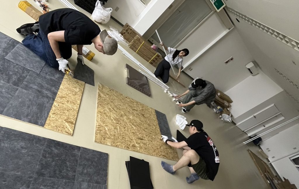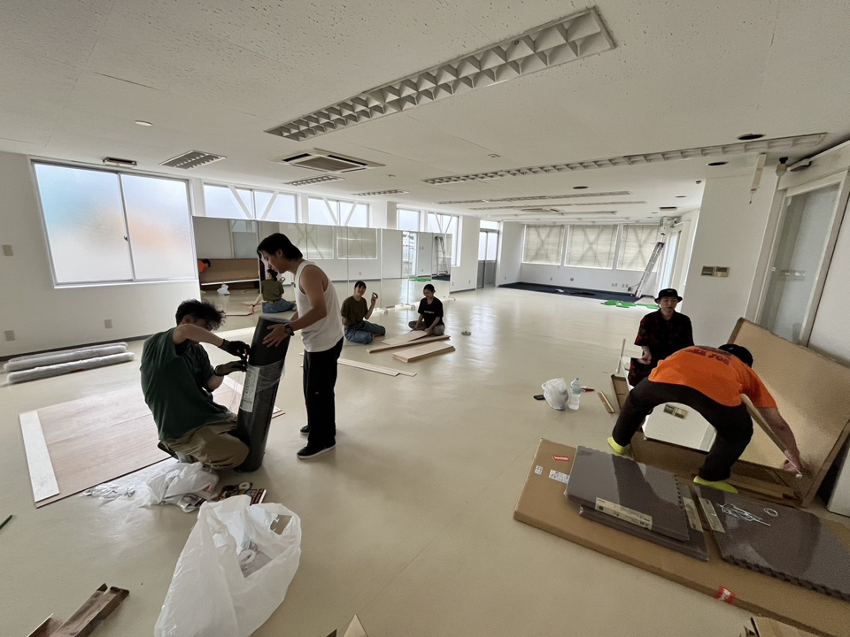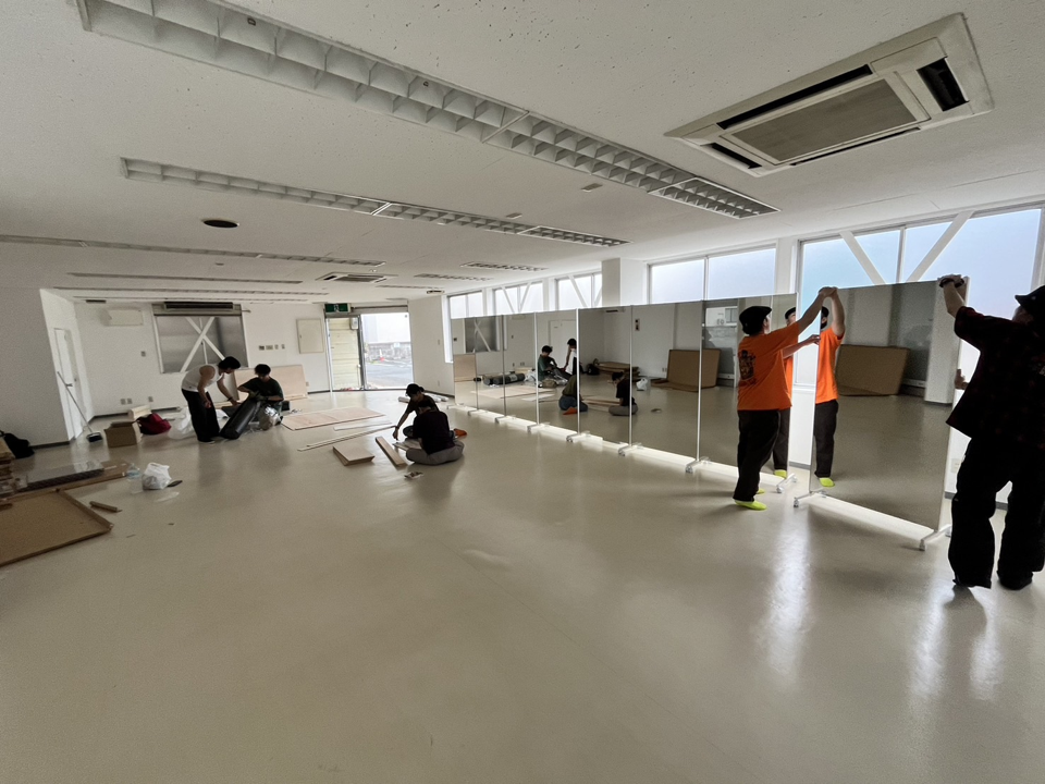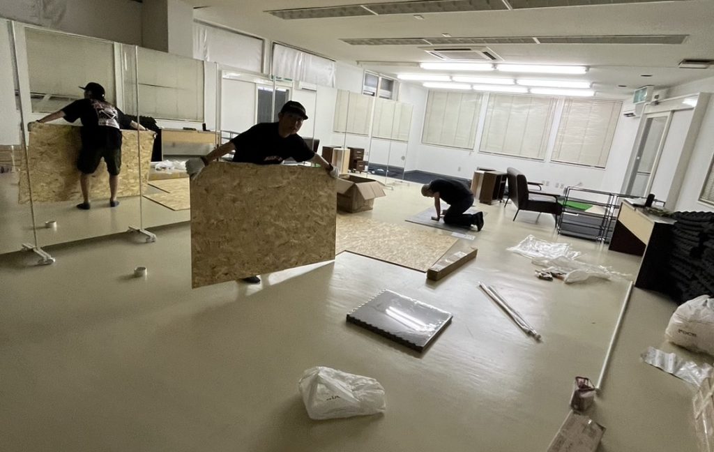 近隣住民の方に配慮した壁際の防音対策や、生徒の皆様にできるだけ快適に使っていただけるような内装にするため、イントラの皆さんはじめ有志の方々にご協力いただいています!